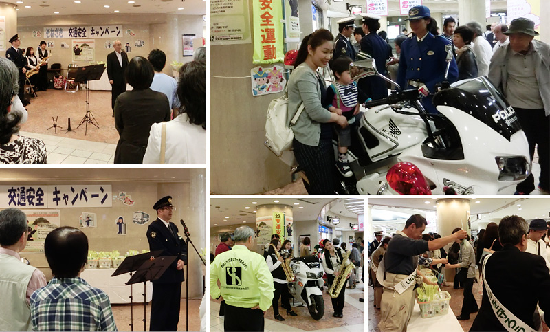 大阪地下街「ディアモール」において「こどもと高齢者の交通事故防止」を呼びかけ、子供用、成人用の反射材(タックルバンド)を配布し交通安全を訴えました。また、女性警察官の「白バイ」と子供の写真撮影も実施し、多くの市民から好評を得ました。